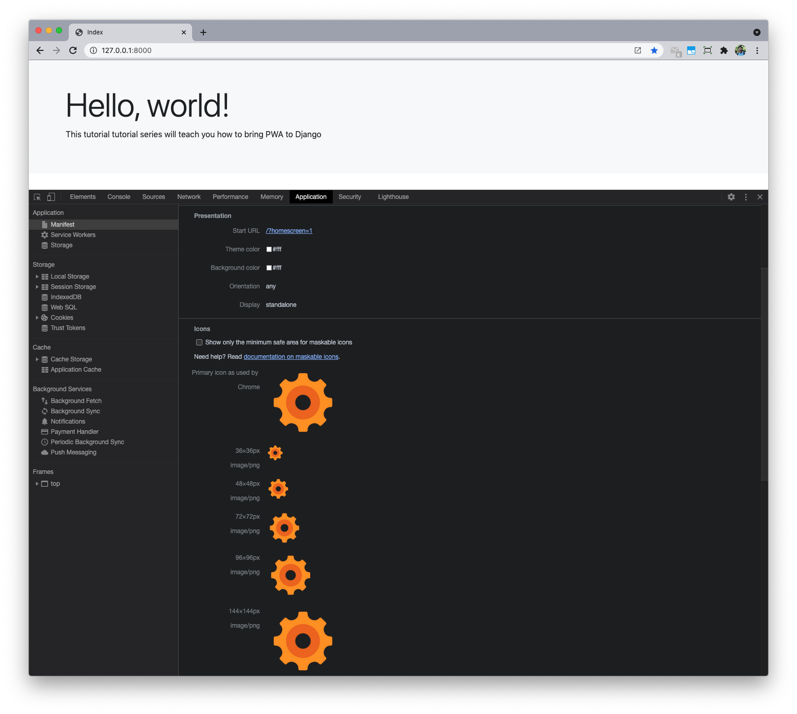 </html>(env)$ python manage.py runserverWe can open dev tools in Chrome, and check Manifest section in the Application tab.