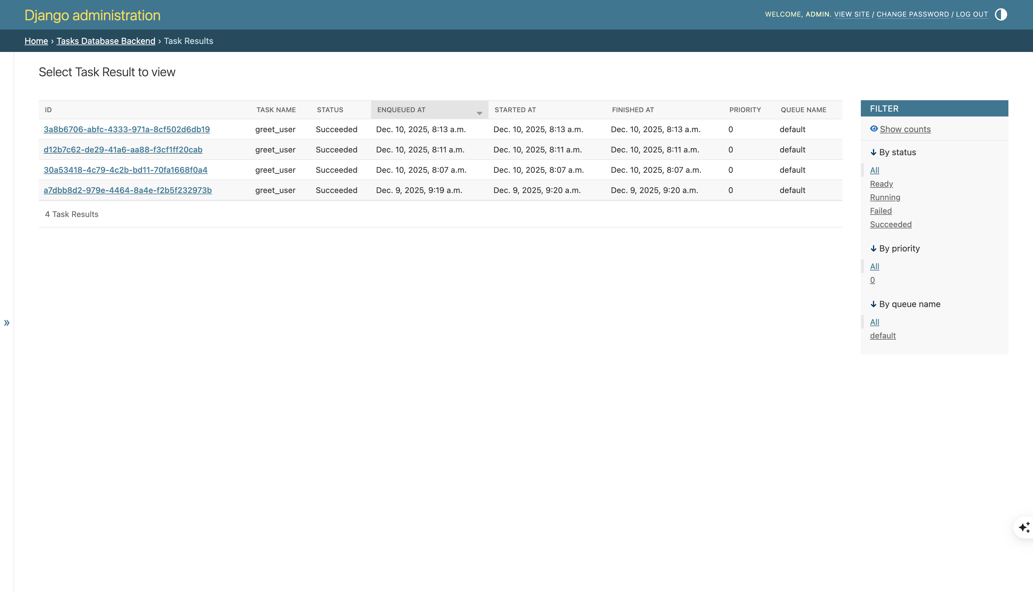 $ python manage.py migrateNow Django-Tasks is set up with the database backend.