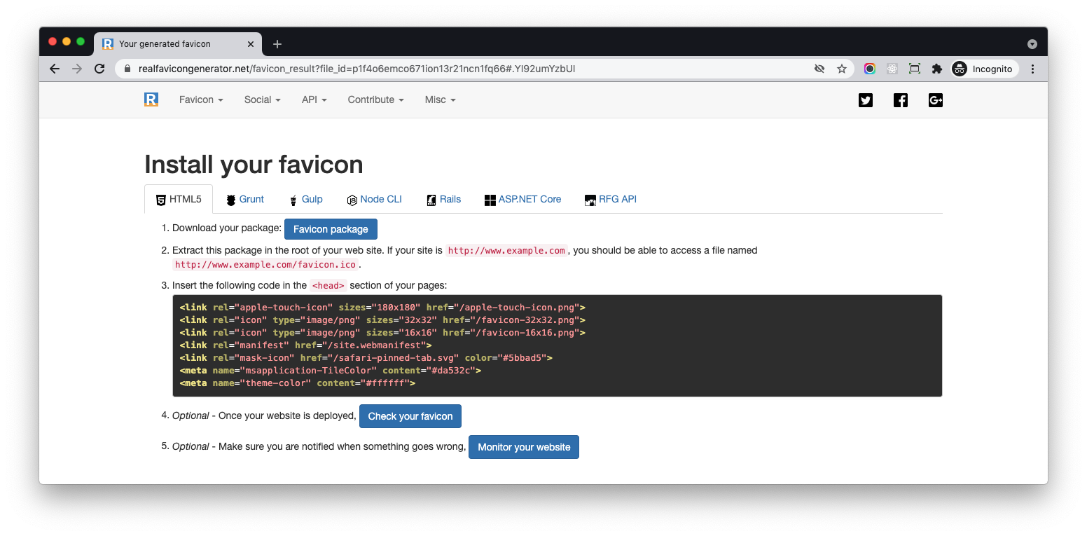 After we confirm, we wil wait some seconds, the favicon package and the HTML code will be available.