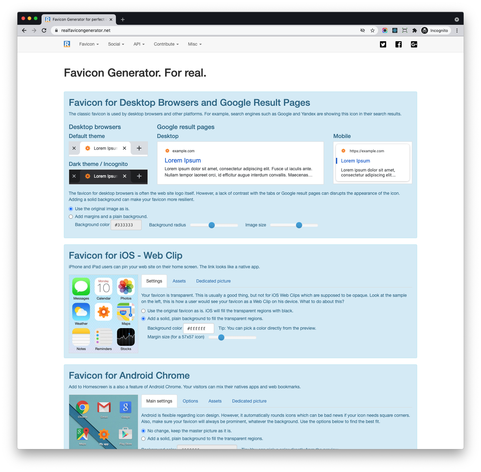 Here, we use https://realfavicongenerator.net/ to help us generate Favicon. You can also use other 3-party services as you like.