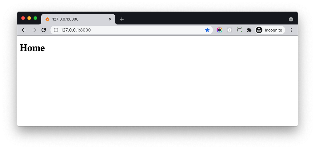 <h1>Home</h1>(venv)$ python manage.py runserverNow you should be able to see Home on the http://127.0.0.1:8000/