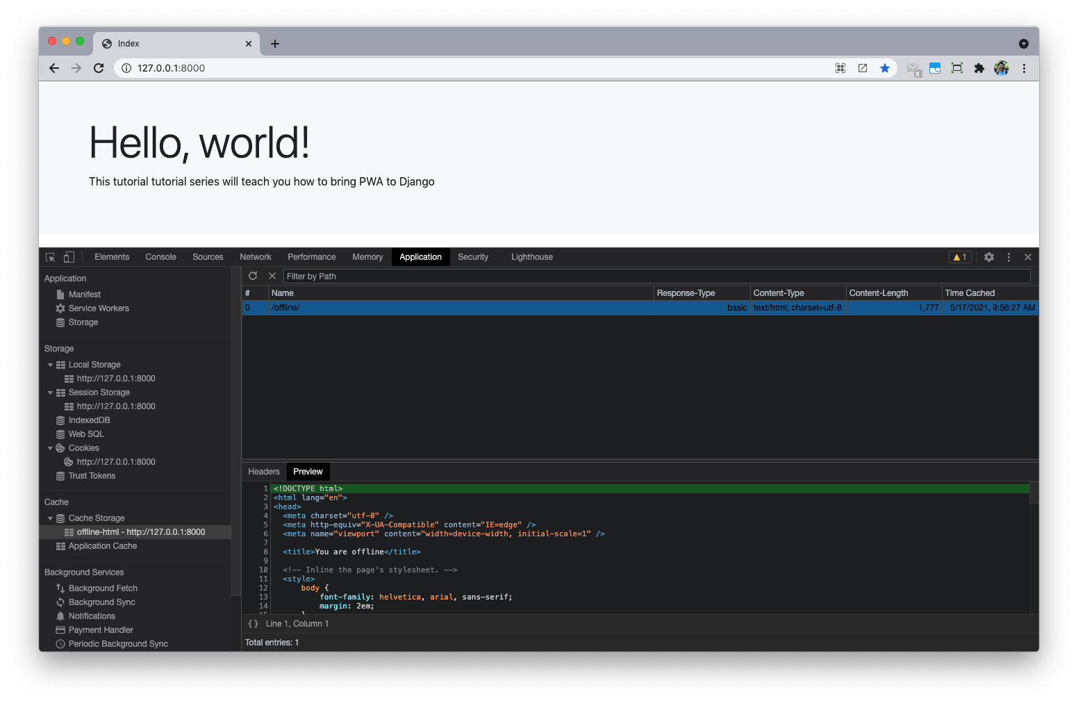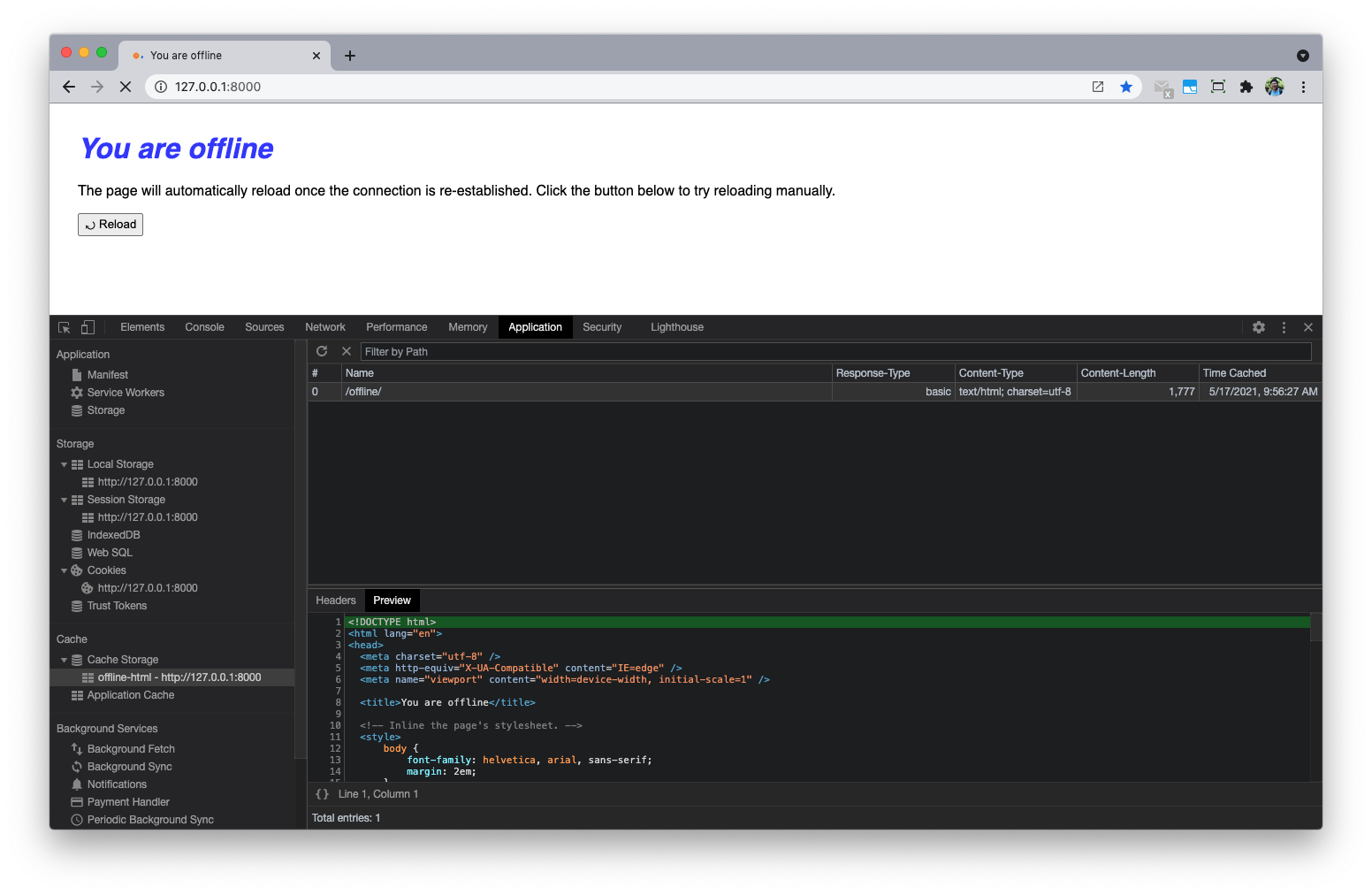 # check on http://127.0.0.1:8000/offline/We wil see the offline page, and it will keep reloading. This is the correct behavior.