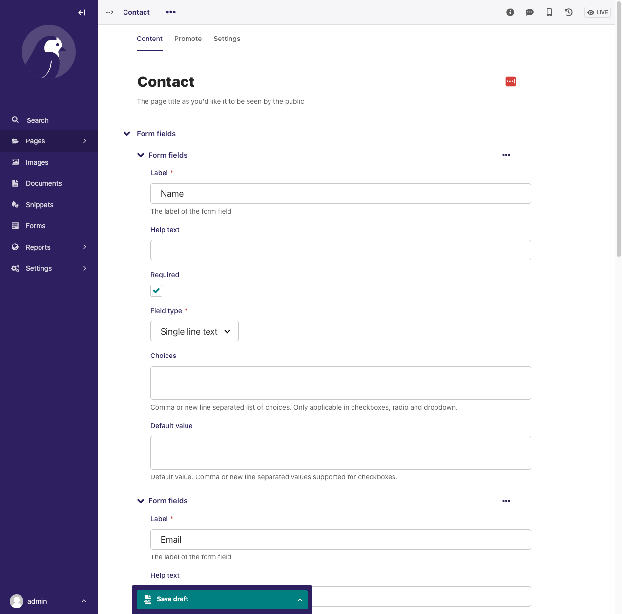 $ docker-compose logs -fCreate a FormPage which has contact slug as child of the BlogPage, and add some form fields.