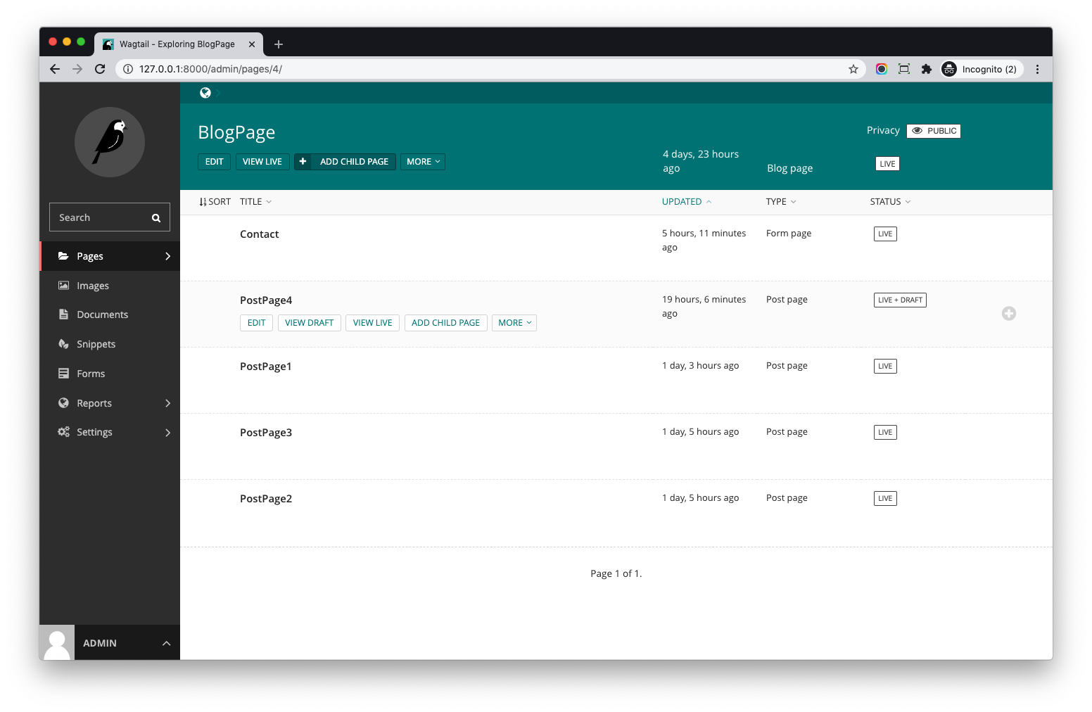 $ docker-compose logs -fPlease go to Wagtail admin, edit the contact page we just created.