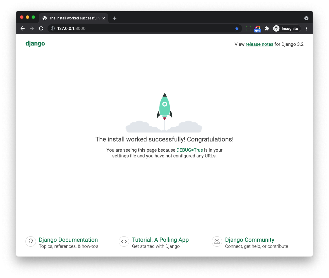 (env)$ python manage.py runserverCheck on http://127.0.0.1:8000/, and you should be able to see the Django welcome page
