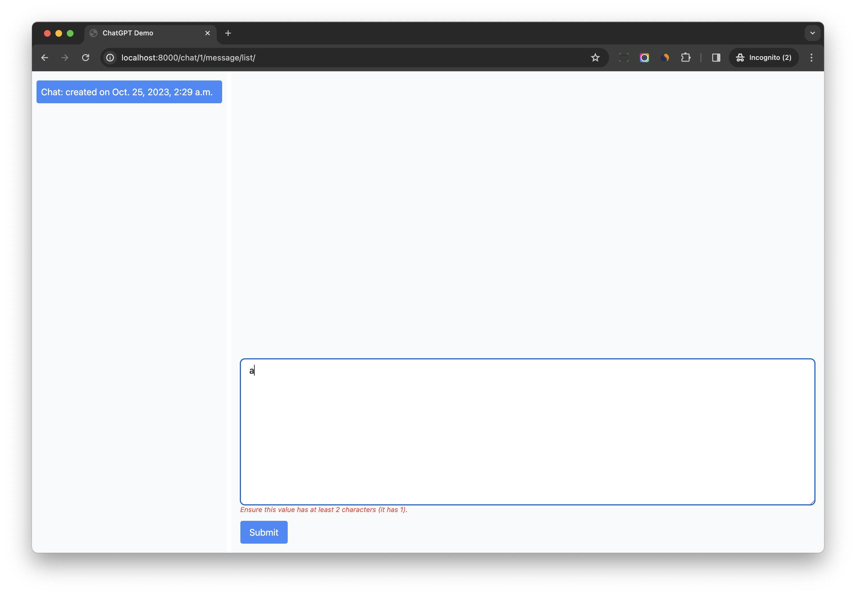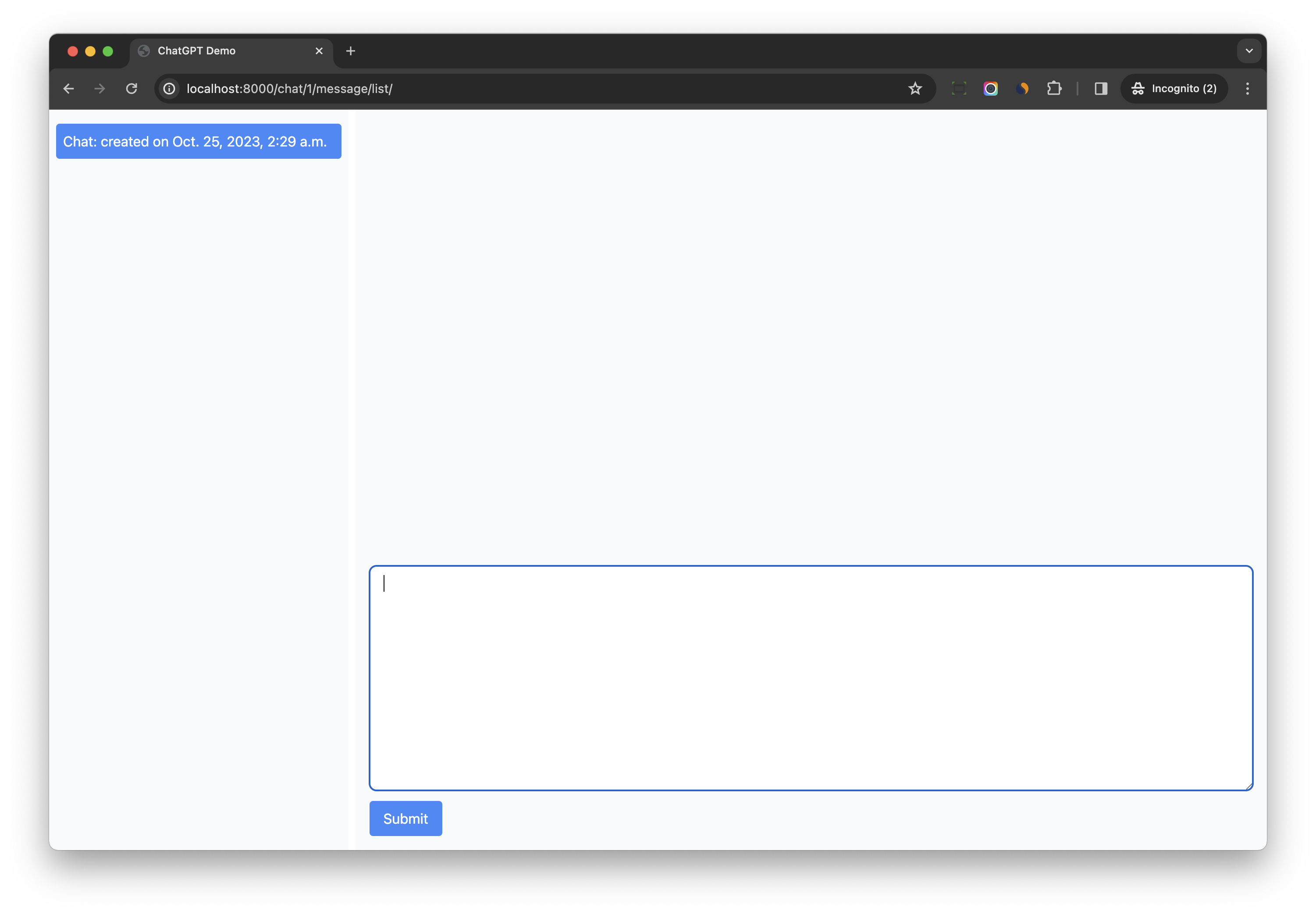 (venv)$ python manage.py runserverOpen http://localhost:8000/chat/ in your browser, we should see the message create form is loaded successfully.