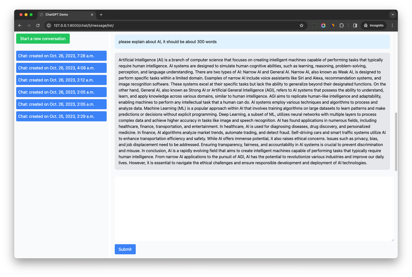 - The signal receive will then send Turbo Stream element of the user message instance to the channel layer group, to append the user message to the message list, "please explain about AI, it should be about 300 words" will be appended to the message list.