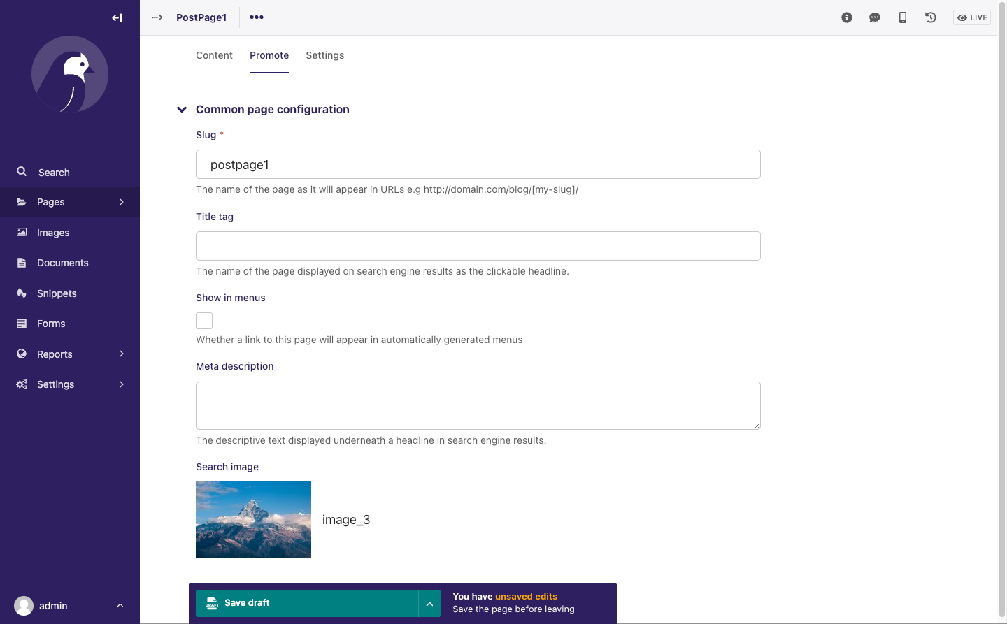 $ docker-compose run --rm web python manage.py migrateAdd meta data in Wagtail admin